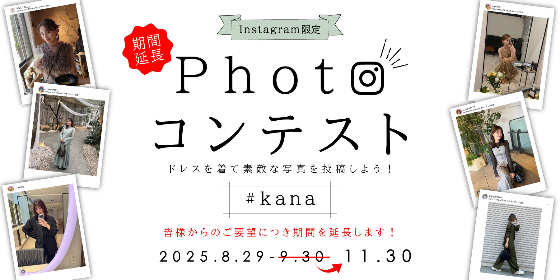 お気に入りの kanaドレス を着て撮影した写真をInstagramに投稿して参加できるフォトコンテストです。
